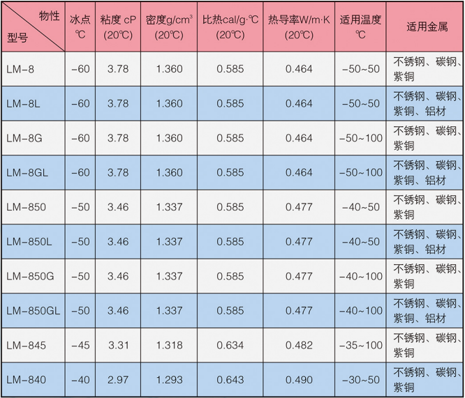 LM-8系列冰河冷媒由改性有機(jī)酸鹽構(gòu)成,主要添加劑包括防腐蝕劑,防霉劑,增溶劑,穩(wěn)定劑等。外觀為淺色液體,沸點高于105℃,不易揮發(fā),無閃點,不可燃,低毒。