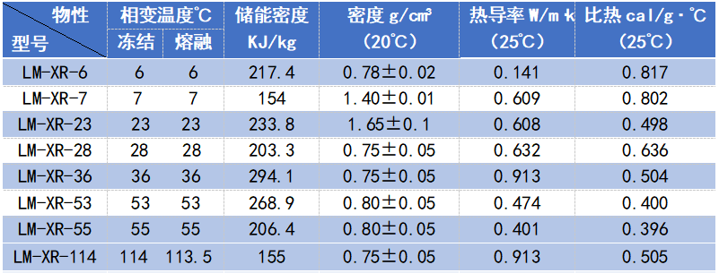 LM-XR系列產(chǎn)品由主儲(chǔ)能劑、相變調(diào)整劑、防過(guò)冷劑、防相分離劑、誘發(fā)劑等多組分復(fù)合制備而成。本品通過(guò)固-液-固相態(tài)變化實(shí)現(xiàn)熱能的儲(chǔ)存和釋放,具有較高的儲(chǔ)能密度及合適的比熱和導(dǎo)熱系數(shù)。本品不易揮發(fā)、安全可靠,可以反復(fù)使用。