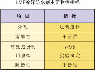 LMF冷媒防水劑主要針對(duì)工業(yè)二氯甲烷等與水不互溶的傳熱介質(zhì)開發(fā)的新型產(chǎn)品,該產(chǎn)品有利于使用二氯甲烷等易揮發(fā)類化學(xué)液體作為載冷劑的制冷系統(tǒng)正常運(yùn)行,具有提高載冷能力,防冰堵冰爆,防銹蝕等優(yōu)異性能。